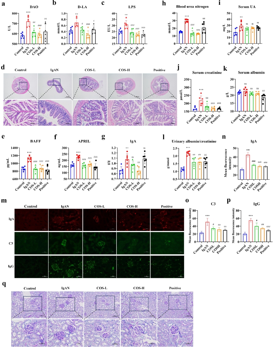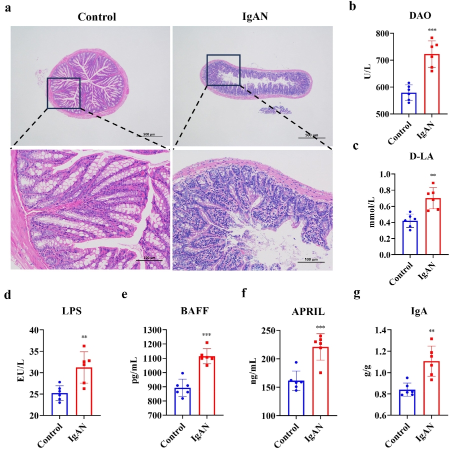 隨后作者采用蘇木精-伊紅(H&E)染色法評估了各組治療小鼠的結(jié)腸完整性,以確定IgAN引起的腸道通透性變化。結(jié)果發(fā)現(xiàn):對照組小鼠的黏膜上皮完整,固有層內(nèi)腺體豐富且排列致密有序,肌層結(jié)構(gòu)清晰。與此同時,IgAN模型小鼠的腸道腺體結(jié)構(gòu)疏松,局部出現(xiàn)松散,肌層增厚,并伴有輕微的淋巴細胞浸潤。此外,通過對腸道通透性指標的評估發(fā)現(xiàn),IgAN組小鼠血清中的二胺氧化酶(DAO)(p?<?0.001)、D-乳酸(D-LA)(p?<??0.01)和脂多糖(LPS)(p?<?0.01)水平顯著升高,尤其是在DAO水平上,這表明IgAN模型小鼠的腸道通透性增加。