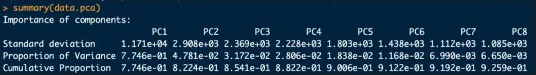 prcomp??函數(shù)的返回值是一個特殊的對象,可以利用summary?函數(shù)來查看分析的結(jié)果。