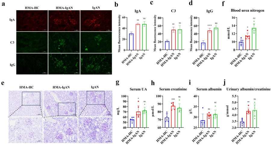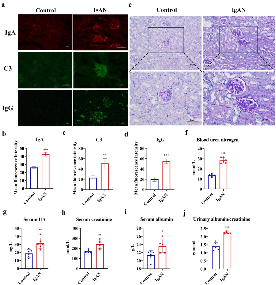 根據(jù)以上研究背景,作者首先確認了IgAN小鼠模型的成功建立。通過分析小鼠腎臟IgA免疫熒光染色,與對照組相比,IgAN組腎小球IgA(p?<?0.001)、C3(p?<?0.01)和IgG(p?<?0.001)沉積顯著增加。PAS染色顯示,IgAN組腎小球系膜細胞增生、系膜基質(zhì)增多及基底膜增厚。腎功能指標評估顯示,與對照組相比,IgAN組小鼠血尿素氮(BUN)(p?<?0.001)、尿酸(UA)(p?<?0.01)、血清肌酐(Scr)(p?<??0.01)、血白蛋白(BAL)(p?<?0.05)及尿蛋白/肌酐比值(ACR)(p?<??0.001)水平顯著增加,IgAN組腎功能顯著下降,這可能與腎臟結(jié)構(gòu)損傷有關(guān)。