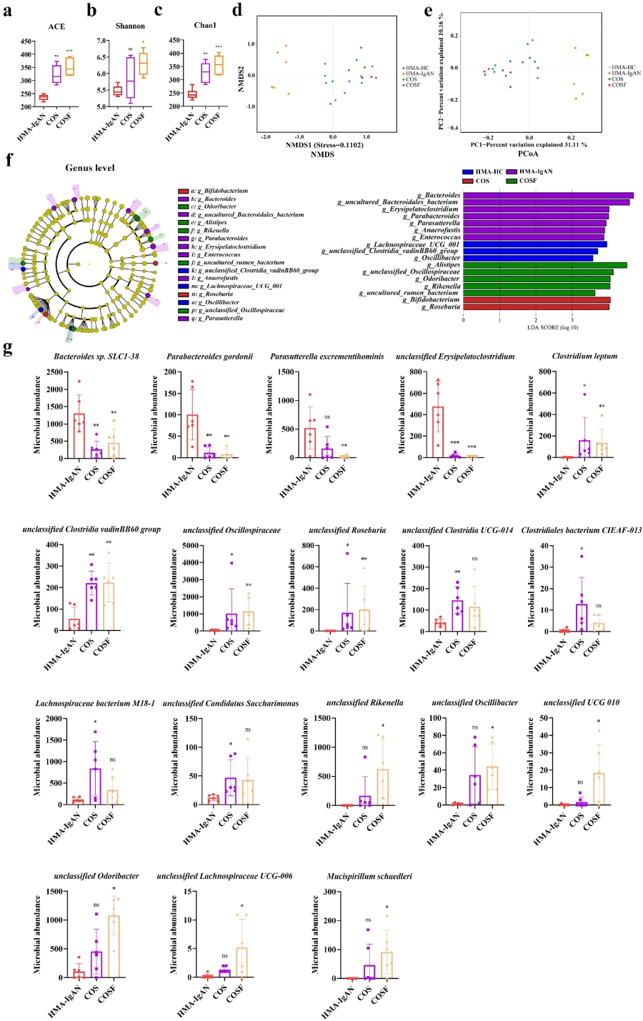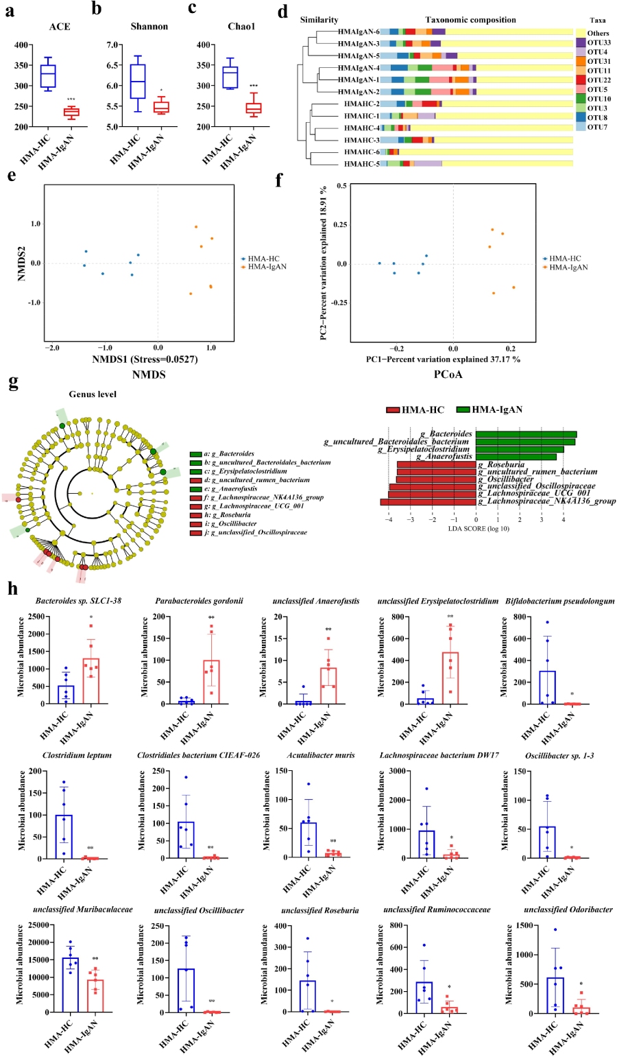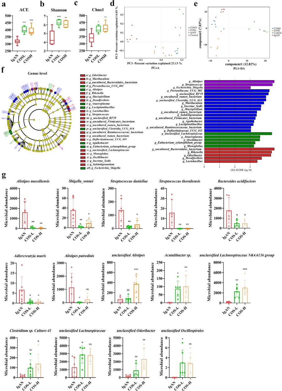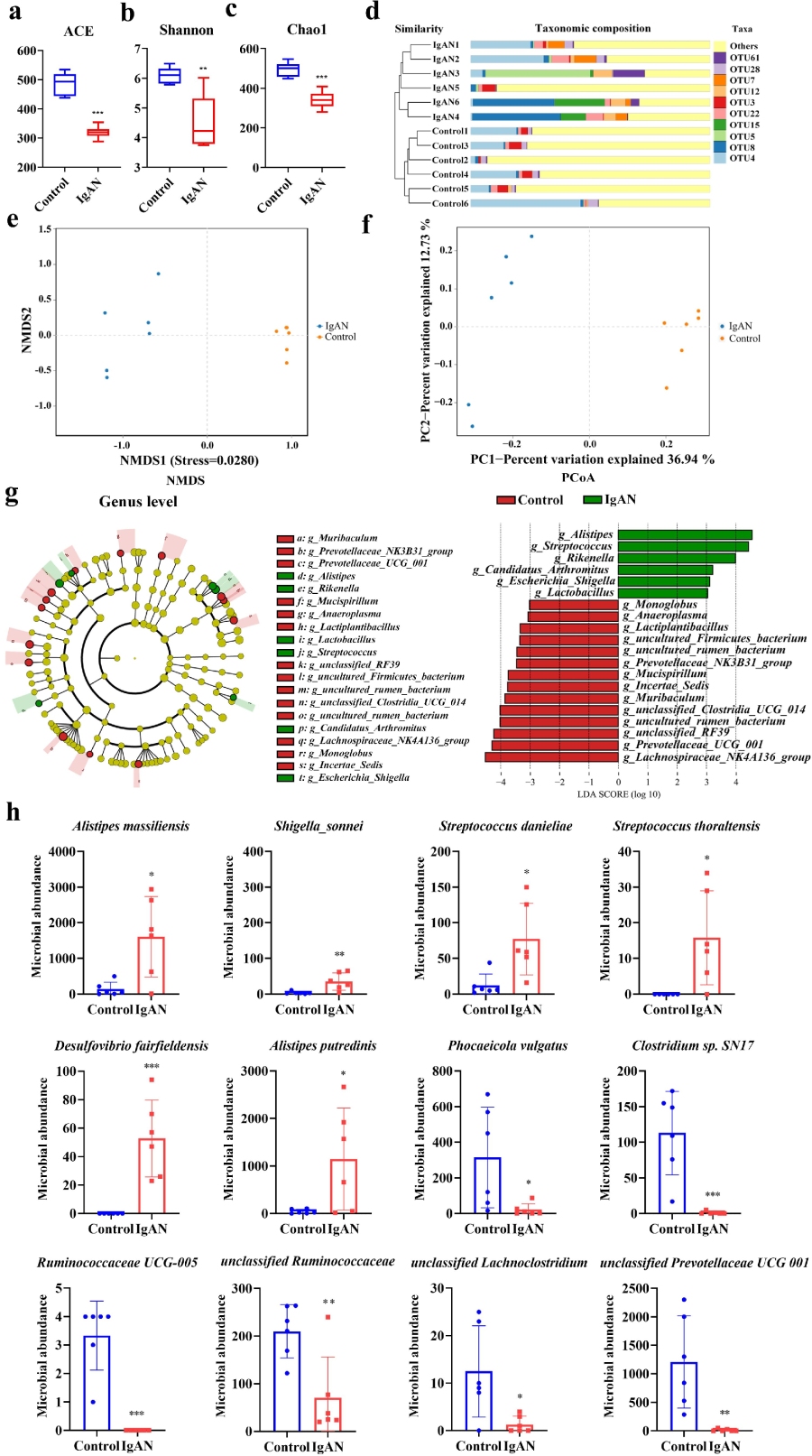 通過構(gòu)建IgAN動物模型,作者發(fā)現(xiàn)與對照組相比,IgAN組的α多樣性分析均顯著降低。此外,采用非加權(quán)組平均法聚類(UPGMA樹)分析、非度量多維尺度分析(NMDS)和主坐標分析(PCoA)進行相似性聚類分析。結(jié)果顯示,IgAN組與對照組表現(xiàn)出明顯的微生物聚類,兩組間存在清晰的分組,表明IgAN誘導(dǎo)了微生物群落的轉(zhuǎn)變。