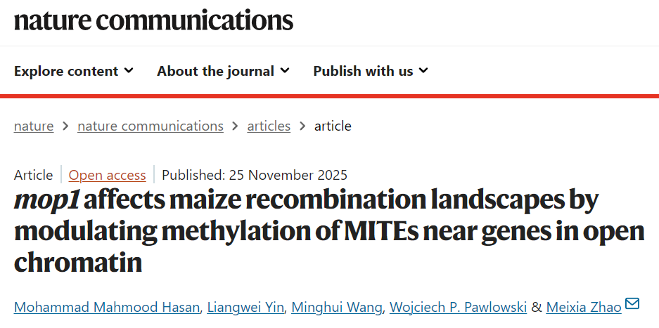 佛羅里達大學(xué)團隊解析玉米重組調(diào)控新機制《Nat Commun》 http://m.591jhtz.com/archives/35612 Wed, 04 Feb 2026 03:51:54 +0000 http://m.591jhtz.com/?p=35612 近日,佛羅里達大學(xué)的Meixia?Zhao教授團隊在國際頂尖期刊《Nature?Communications》上發(fā)表了題為“mop1?affects?maize?recombination?landscapes?by?modulating?methylation?of?MITES?near?genes?in?open?chromatin”的研究論文。