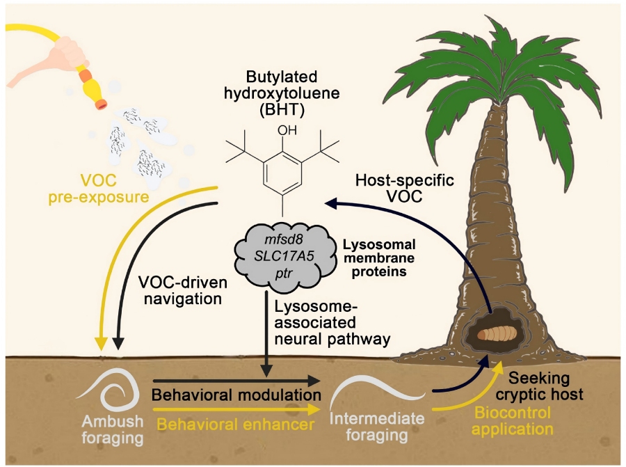 在機制層面,研究進一步從行為調(diào)控角度出發(fā),通過對暴露于BHT的線蟲進行轉(zhuǎn)錄組測序,解析了溶酶體相關(guān)神經(jīng)通路在這一過程中所起的作用。結(jié)果表明,寄主揮發(fā)物信號能夠通過影響線蟲體內(nèi)相關(guān)轉(zhuǎn)運系統(tǒng)與代謝狀態(tài),進而改變其神經(jīng)活動與行為輸出。研究成功將化學(xué)信號、能量代謝與行為響應(yīng)建立起關(guān)聯(lián),體現(xiàn)了從生態(tài)現(xiàn)象到生理調(diào)控的跨層級認知整合。在應(yīng)用基礎(chǔ)層面,該研究為生物防治技術(shù)的發(fā)展提供了新的思路。通過利用寄主揮發(fā)物或模擬信號對線蟲進行“生態(tài)預(yù)激”?,可實現(xiàn)對生防線蟲行為的精準調(diào)節(jié),從而提升其在隱蔽性或鉆蛀型害蟲(如紅棕象甲、番茄潛葉蛾等)防控中的效率,減少化學(xué)農(nóng)藥依賴,推動農(nóng)業(yè)綠色發(fā)展。這一成果不僅拓展了生物防治的技術(shù)邊界,也為農(nóng)業(yè)生物安全提供了新的科學(xué)支撐。