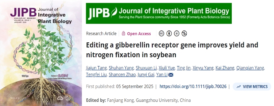 Tang, J., Yang, S., Li, S., Yue, X., Jin, T., Yang, X., Zhang, K.,Yang, Q., Liu, T., Zhao, S., et al.?(2025). Editing a gibberellin receptor gene improves yield and nitrogen ?xation in soybean.J. Integr. Plant Biol.?