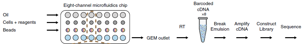 10 X Genomics單細(xì)胞轉(zhuǎn)錄組測序平臺利用微流控、油滴包裹和baecode標(biāo)記等技術(shù)來實(shí)現(xiàn)高通量的細(xì)胞捕獲技術(shù),能夠一次性分離、并標(biāo)記500–10000個(gè)單細(xì)胞,從而獲得每個(gè)細(xì)胞的3’端的轉(zhuǎn)錄組信息。具有細(xì)胞通量高、建庫成本低、捕獲周期短等優(yōu)勢。該技術(shù)主要用于細(xì)胞分型和標(biāo)記因子的鑒定,從而實(shí)現(xiàn)對細(xì)胞群體的劃分與細(xì)胞群體間基因表達(dá)差異的檢測,此外該技術(shù)還可以預(yù)測細(xì)胞分化與研究發(fā)育軌跡,在當(dāng)下疾病、免疫、腫瘤領(lǐng)域以及組織、器官、發(fā)育研究中發(fā)揮越來越重要的作用。