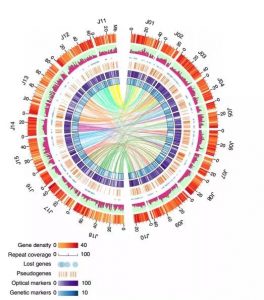 然后利用遺傳圖和光學(xué)圖譜對(duì)A、B亞基因組進(jìn)行區(qū)分,整體掛載效果非常好,A為91.48%,B為72.32%。利用光學(xué)圖譜和遺傳圖譜對(duì)基因組進(jìn)行區(qū)分,為其他多倍體物種基因組研究提供了參考。