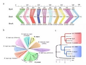 如上圖,a中對(duì)芥菜A、白菜A、甘藍(lán)型油菜A進(jìn)行共線性分析,可以發(fā)現(xiàn)其是高度共線的。